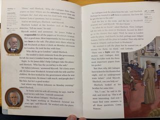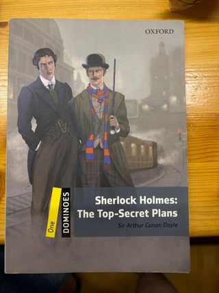 “Lectura en inglés nivel básico (A1–A2) con vocabulario sencillo y actividades, donde Holmes y Watson investigan la muerte de un joven y el robo de unos planes secretos de submarinos.” ESCUELA
