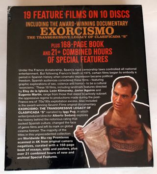 Pack editado por Severin. 10 discos blu ray. Incluye un libro de 168 páginas (en Ingles). 18 películas españolas producidas entre el tardofranquismo y la transición y un largometraje documental sobre el fenómeno de las peliculas clasificadas "S". Varios géneros: terror, ciencia ficción, erotismo, drama y documental. Hay peliculas difíciles de clasificar, como Rostros o Poppers. Titulos incluidos: ver la última foto (no figura el documental). Todos con audio español. Directores: Eugenio Martin, Eloy de la Iglesia, Leon Klimowsky y otros. Interpretes: Paul Naschy, Patty Shepard, Simon Andreu, Esperanza Roy, Nadiuska, etc. Precintado