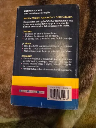 Diccionario Oxford Pocket para estudiantes de inglés Español-Inglés Inglés-Español Tiene los bordes del diccionario pintados por el exterior y la primera hoja rota pero el resto está en perfectas condiciones (ver fotos)