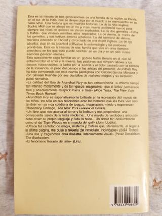 Esta es la historia de tres generaciones de una familia de la región de Kerala, en el sur de la India, que se desperdiga por el mundo y se reencuentra en su tierra natal. Una historia que es muchas historias. La de la niña inglesa Sophie Moll que se ahogó en un río y cuya muerte accidental marcó para siempre las vidas de quienes se vieron implicados. La de dos gemelos –Estha y Rahel– que vivieron veintitrés años separados. La de Ammu, la madre de los gemelos, y sus furtivos amores adúlteros. La del hermano de Ammu, marxista educado en Oxford y divorciado de una inglesa. La de los abuelos, que en su juventud cultivaron la entomología