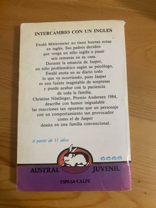 ¡Diversión y humor para jóvenes lectores! 🇬🇧 • Autor: Christine Nöstlinger (Premio Andersen 1984). • Sinopsis: Ewald Mittermeier no saca buenas notas en inglés, así que sus padres traen a Jasper, un niño inglés, a pasar seis semanas con ellos. Sin embargo, Jasper resulta ser un niño "problemático" que pondrá a prueba la paciencia de toda la familia en una historia llena de humor. • Edad recomendada: A partir de 11 años. • Estado: En buen estado, perteneciente a la clásica colección Austral Juvenil de Espasa-Calpe. Portada con ilustraciones de G. Amechazurra. • Ideal para: Coleccionistas o como lectura escolar