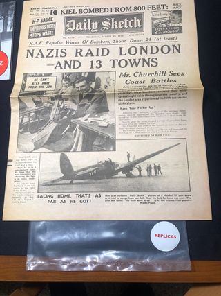replica de periodico inglés Daily Sketch, 29 de agosto de 1940 ( réplica en perfecto estado) en porta Nazis raud London
