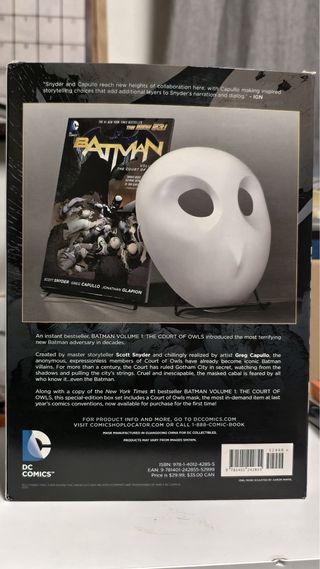 Set de Batman: La Corte de los Búhos que incluye un libro y una máscara. -Libro cómic The Court of Owls (EN INGLÉS) -Máscara inspirado en La Corte de los Búhos. En perfecto estado