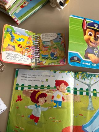 Cinco libros de ellos, uno de la patrulla canina, aprendo colores en inglés, vehículos y máquinas, un parque lleno de emoción, donde los niños aprenden a reconocer las emociones y los tres cerditos