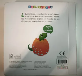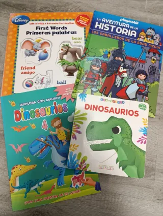 4 libros infantiles: 2 de dinosaurios (uno con movimiento y el otro de pegatinas). Otro de historia de Playmobil y el ultimo de inglés con personajes d Disney con pestañas