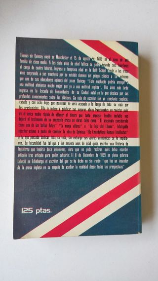 Autor: THOMAS DE QUINCEY Un revelador relato autobiográfico de su adicción al opio. Barcelona, Producciones Editoriales S.A. Colección STAR BOOKS n° 2, 1976. 253 págs.Traducción: Horacio Quinto. Portada: Juan José & Pili. BUEN ESTADO Su interior algo amarillo por el paso del tiempo. Con nombres —y fecha/lugar de adquisición— de antiguo propietario.