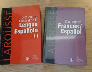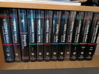 Diccionarios de castellano, inglés y francés. Algunos todavía conversan el plástico inicial.