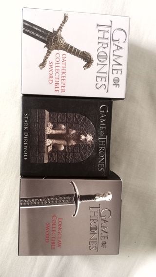 Pack 3 miniaturas Juego de Tronos: Longclaw (espada garra) Incluye una réplica de 10 cm aprox de la espada de Jon Snow, Longclaw, una funda para la espada, un soporte para mostrar la espada y un mini libro de 48 páginas sobre la Guardia de la Noche, ilustrado. Stark direwolf : Figura 7,6 cm + mini libro 45 pag. El lobo huargo, una gran criatura del norte, es el sello de la Casa Stark. Estatuas de piedra a imagen del lobo huargo flanquean la entrada a la cripta de Invernalia. Oathkeeper famosa espada (10cm aprox) de acero valyrio de Game of Thrones, Oathkeepe de Jaime Lannister.