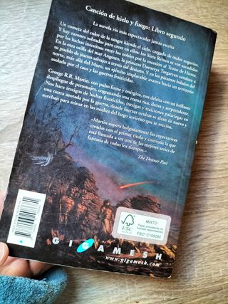 Primer libro de Canción de hielo y fuego (Juego de tronos). El segundo ya no está disponible. Edición de bolsillo (tapa blanda) de la editorial Gigamesh. La tapa está algo doblada (se ve en la segunda foto). 8€.