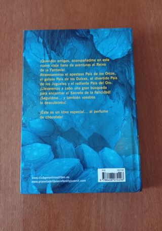 Libro de la colección de Gerónimo Stilton "Regreso al reino de la fantasía", de tapa dura. No hay nada escrito. En perfecto estado, pero no mantiene mucho el olor a chocolate ya que lo tenemos guardado desde hace tiempo. Editorial: destino.