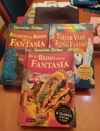Lote de 3 libros de Geronimo Stilton en tapa dura e ilustrados. Los libros son: -En el reino de la fantasía. -Regreso al reino de la fantasía. -Cuarto viaje al reino de la fantasía. Los libros están en perfecto estado. Solo hay un defecto en el de En el reino de la fantasía, que tiene dos hojas separadas. El precio es por el lote.