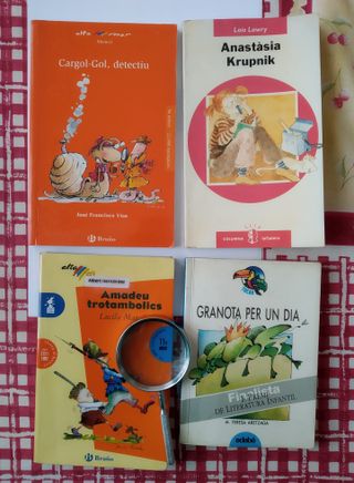 Vendo 4 libros infantiles en Catalán a 5 euros cada uno, si llevas más de uno podemos arreglar precio. Cargol-gol, detectiu, esta Nuevo (José Francisco Viso, ilustrado a color, incluye taller de lectura), Granota per un dia (Teresa Aretzaga, ilustrado a color), Anastàsia Krupnik (Lois Lowry, sin ilustraciones, con el nombre a lápiz del anterior propietario), Amadeu Trotambolics (Lucila Mataix, tiene marcas de escritura con grafito).