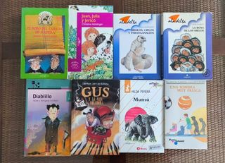 8 Libros juveniles de 7-8 años: Una sombra fresca, Mumú, Gus y la casa voladora, Diablillo, La Rosa de los hielos, Lirolos, Ciflos y Paranganalios, Juan, Julia y Jericó, y El robo de caballo de madera. Como nuevos. Se pueden vender por separado por 3 euros.
