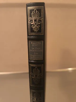 Libro de Walter Scott con los títulos La Maga de la Montaña y Los Desposorios de Triermain. - Portada negra con detalles dorados. - Encuadernación clásica.
