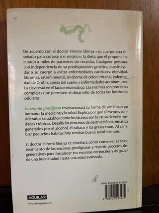 Tiene remarcados, fotos. Tu cuerpo está diseñado para curarse a sí mismo.Puedes ayudar a tu cuerpo a evitar enfermedades. La enzima prodigiosa revolucionará tu forma de ver el cuerpo humano, la medicina y la salud. De acuerdo con el doctor Hiromi Shinya «tu cuerpo está diseñado para curarse a sí mismo»; la dieta que él propone ha curado a miles de pacientes sin recaídas. Cualquier persona, con independencia de su predisposición genética, puede ayudar a su cuerpo a evitar enfermedades cardiacas, obesidad, fibromas, estreñimiento, síndrome de colon irritable, enfermedad de Crohn, apnea del sueño y enfermedades autoinmunes. La clave