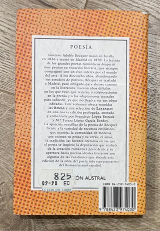 ISBN: 84-239-7403-0 LIBRO DE POEMAS DE GUSTAVO ADOLFO BÉCQUER. Este volumen ofrece reunidas las RIMAS y una selección de LEYENDAS en una nueva edición prologada. La aparente sencillez de la poesía de Bécquer frente a la variedad de recursos estilísticos que maneja; la comunidad de motivos que animan su prosa y su verso; el amor, la tradición; las fuentes literarias en las que el poeta se inspiró; la depuración que realizó de la creación romántica precedente y su apertura hacia nuevos ideales literarios son algunas de las cuestiones que aborda esta edición de la obra del poeta más representativo del Romanticismo español.