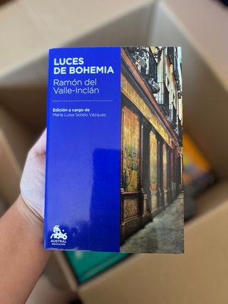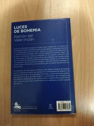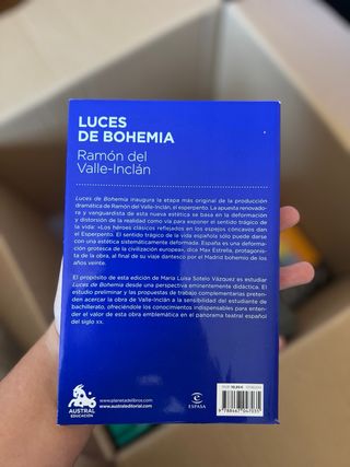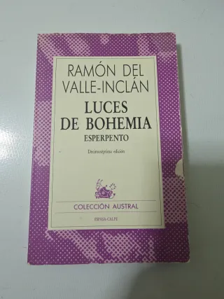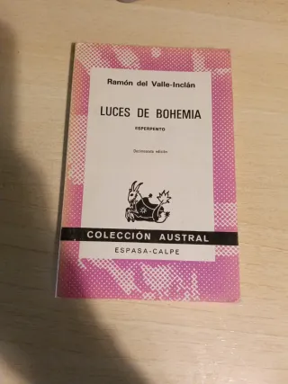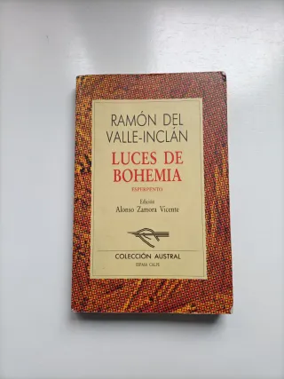 Luces de bohemia – Ramón del Valle-Inclán (Editorial Austral) Vendo el libro Luces de bohemia, obra fundamental del teatro español y del esperpento, escrita por Ramón del Valle-Inclán. Edición de Editorial Austral, práctica y muy utilizada en institutos y universidades. 🔹 Clásico de la literatura española 🔹 Lectura obligatoria en Bachillerato y PAU 🔹 Texto completo 🔹 Ideal para estudio o colección