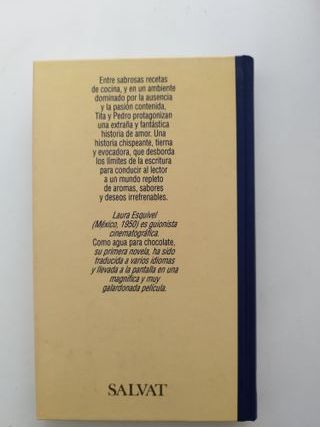Hago lotes con otros productos de mi perfil, con 10% de descuento. Envío por Wallapop. Un amor imposible para cuya consecución la protagonista recurrirá a las artes culinaras. Bajo la apariencia de un folletín por entregas y encabezando cada capítulo con una receta esta historia mágica convierte la gastronomía en un código de sensualidad cargado de penetrantes aromas de colores deslumbrantes. Tita es la pequeña vive en un rancho con sus hermanas y sus sirvientas y pese a saberse condenada a no poder gozar del amor por tener que hacerse cargo de su madre no renunciará a Pedro.