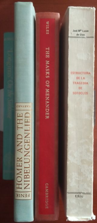 Varios textos fundamentales de obras griegas muy rebajados On the Sublime - Hardcover Longinus; D.A. Russell [ed.] Editorial: Oxford University Press/Clarendon Press ISBN 0-19-814162-9 Libro muy dificil de encontrar. D. Wiles, The Masks of Menander: Sign and Meaning in Greek and Roman Performance. Cambridge: Cambridge University Press, 1991. Pp. xv + 271, 8 pls, 9 figs. ISBN 0-521-40135-6 Hardcover – 18 July 1991 En mal estado ESTRUCTURA DE LA TRAGEDIA DE SOFOCLES LUCAS DE DIOS JOSE MARIA Consejo Superior de Investigaciones Científicas - 9788400054427 Homer & the Niebelungenlied – Comparative Studies in Epic Style (Martin Classical