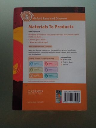 Libros de texto en inglés de Oxford Read and Discover. Los títulos son “Wonders of the Past” de Kathryn Harper y “Materials To Products” de Alex Raynham. Son de nivel A1-A2 y A2-B1, respectivamente, utilizados para cursos consecutivos de secundaria. Ambos incluyen su referido texto, ejercicios complementarios y su versión leída para practicar la comprensión auditiva. El precio es de 9€ cada uno.