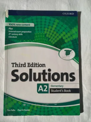 Vendo libro de inglés Solutions A2, Elementary, libro del alumno student's book, editorial Oxford, ISBN 9780194523639, algún ejercicio a lápiz pero el libro está muy bien, también tengo el libro de ejercicios workbook con ejercicios escritos a lápiz, hago envíos, preparo lotes, precio 3 euros los dos ejemplares.
