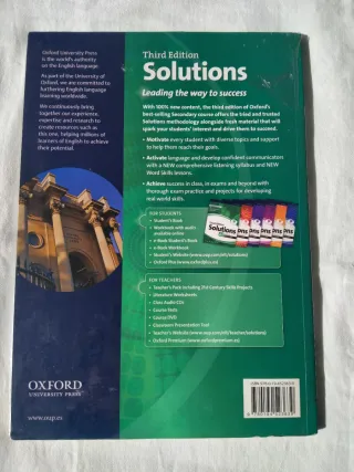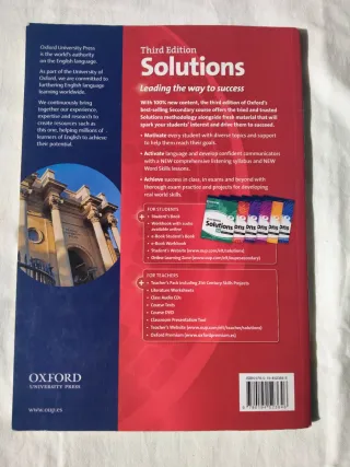 Vendo libro de inglés Solutions B1, Pre-Intermediate, libro del alumno student's book, editorial Oxford, ISBN 9780194523646, algún ejercicio a lápiz pero el libro está muy bien, también tengo el libro de ejercicios workbook con ejercicios escritos a lápiz, hago envíos, preparo lotes, precio 3 euros los dos ejemplares.