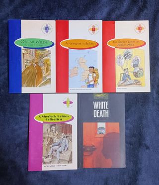 Pack de 5 libros de lectura en inglés de Eso y Bachiller. Burlington Books y Oxford Bookworms. En muy buenas condiciones. "A Sherlock Holmes Collection" - 3° ESO "The secret diary of Adrian Mole" y "A foreigner in Britain" - 1° Bachiller "Oscar Wilde" - 2° Bachiller "White Death" (incluye CD audio) - Bachiller (4€) Libro individual: 3€ ✴️Precio pack: 14€ Se puede entregar en mano en Granada. Más libros, cómics, videojuegos, merchandising, ropa, y otros artículos en mi perfil 📚🎮🖼️👢👗