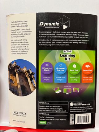 Libro Inglés Dynamic Students book Oxford 3ºESO El libro está usado y presenta marcas del uso, pero el interior está bien conservado. Tiene algunas marcas en lápiz y bolígrafo, pero no dañan el texto. Algunas hojas tienen marcas por haber doblado las esquinas. Le falta la primera página, sin contenido académico por tener los datos del niño y del colegio.