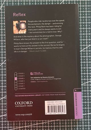 Vendo el libro Reflex de Dick Francis, publicado por Oxford University Press en la colección Oxford Bookworms Library (Stage 4 – Thriller & Adventure). • ISBN: 978-0-19-479182-3 • Estado: Como nuevo. Solo tiene escrito mi nombre en la primera página, por lo demás está impecable, sin subrayados ni marcas de uso.