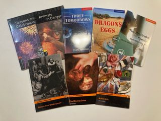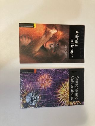 Libros en inglés para varios niveles (4€ cada libro. 30€ todos) Cambridge: - “Three Tomorrows” (nivel A1) - “The Fruitcake Special” (B1) - “Dragons’ Eggs” (B2) (NO DISPONIBLE) Penguien Readers: - “The Missing Coins” (Level 1-Beginner) - “British Life” - “Stories from Shakespeare” (Level 3-Pre-Intermediate) Oxford: - “Animals in Danger” (Stage 1) - “Seasons and Celebrations” (Stage 2)