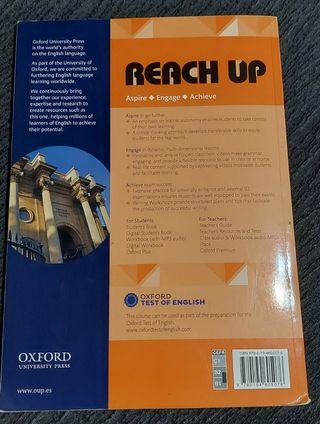 Reach Up – Oxford University Press (Libro de inglés) Vendo libro Reach Up de Oxford University Press, utilizado para preparación de inglés nivel B2–C1. ✅ Interior en buen estado ⚠️ Exterior con signos normales de uso (ver fotos) ❌ No incluye código digital 📘 Ideal como libro de apoyo, repaso o estudio por tu cuenta 📦 Entrega en mano o envío por Wallapop 💬 Cualquier duda, pregúntame sin compromiso
