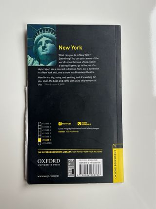 Libro nivel Stage 1 de Oxford "New York". Tiene partes subrayadas.