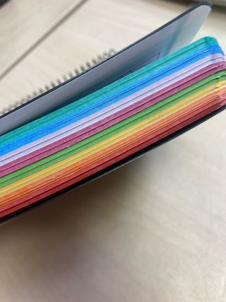 Libro de actividades, algunas páginas escritas a lápiz, fácil de borrar. Está forrado