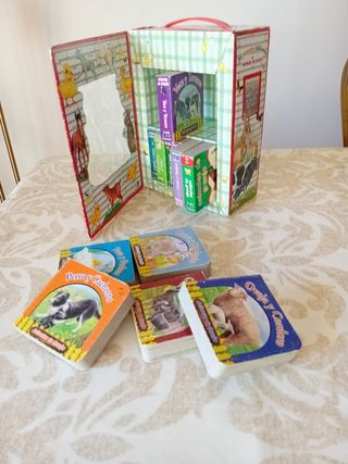 Biblioteca de cartón con 12 minilibros de hojas duras muy visuales. De animales de granja