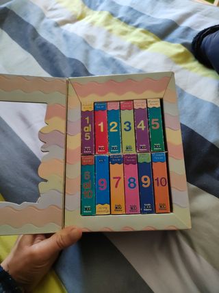 Pequeña biblioteca con 12 libros de hojas gordas para buena manipulación y resistencia. Con asa para trasporte. Ocupa poco ya que se recoge perfectamente en la caja como se ve en las fotos. Cada libro tiene ilustraciones con varios dibujos para que los niños aprendan a contar y asociarlo con su número. Está usado pero bien conservado Hago envíos a cargo del comprador