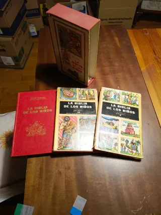 Tres libros tapa dura con ilustraciones adaptación de la Biblia para niños. Parecen un solo libro porque van metidos en esa carcasa que es la primera foto