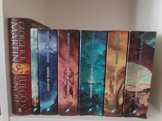 Colección completa de la saga cancion de hielo y fuego. 21 cm. Edición ya descatalogada, de la editorial gigamesh, primera en publicar la saga en español. El Caballero de los siete reinos, 1° edición Juego de Tronos, 3° edición Choque de Reyes, 3° edición Tormenta de espadas, 3° edición Festín de cuervos, 2°edicion Danza de dragones, 2° edición Fuego y Sangre, 1° edición, en tapa dura de la editorial Plaza y Janes