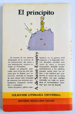 Se entrega en mano, se hacen envíos. Bizum, Paypal. El Principito. 1ª edic. México. 1978 Título: EL PRINCIPITO. Editorial: Editores Mexicanos Unidos, S.A. Edición: 1ª Edición Año de publicación: 1978 Encuadernación: Encuadernación de tapa blanda. 99 páginas. Condición: (Muy buena) Sin escritos, sin pérdidas, sin roturas, sin hojas sueltas. La encuadernación muy buena. Contiene sello y nombre de propietario.