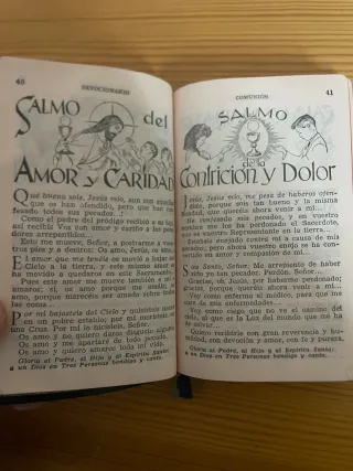 Cinco pequeños libros religiosos antiguos, todos en color negro y en distintos formatos. Varias encuadernaciones son en piel y algunos conservan su funda original tipo estuche que deja visible el lomo. En excelente estado de conservación. Entre los títulos: “Visitas al Santísimo Sacramento y a la Inmaculada Virgen María” (1941) y “La práctica de los cinco primeros sábados en honor del Inmaculado Corazón de María” (1947). Algunos incluyen estampitas religiosas entre sus páginas. Precio por unidad: 9 €. Lote completo (5 libros): 39 €.