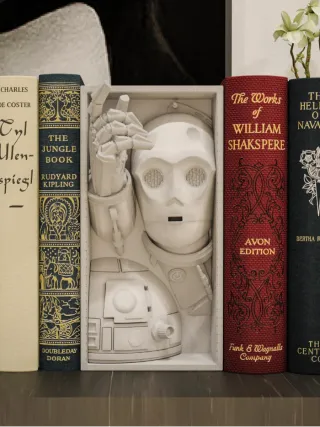 Este rincón de libros presenta un diseño inspirado en Star Wars, con la figura de C-3PO. - Figura detallada de C-3PO. - Incluye libros como The Jungle Book y The Works of William Shakspeare.