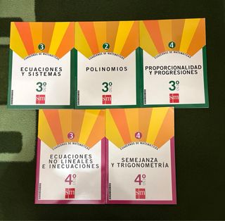 5 libros de matemáticas: - Ecuaciones y sistemas (3ºESO) - Polinomios (3ºESO) - Proporcionalidad y progresiones (3ºESO) - Ecuaciones no lineales e inecuaciones (4ºESO) - Semejanza y trigonometría (4º ESO)