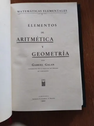 2 libros del catedrático de la Facultad de Ciencias de Zaragoza, Gabriel Galán galán. 1.Elementos de Aritmética y Álgebra de 1931 y 2.-Curso de Geometría y Trigonometría de 1930. reencuadernados en una cuidada decidida en piel tapa dura en un solo volumen.