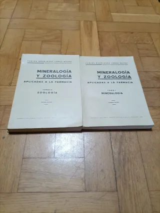 Libros de 1934. Tomos I y II de Mineralogía y zoología aplicadas a la farmacia de Carlos Rodríguez López -Neyra, catedrático de la Facultad de Farmacia en la Universidad de Granada. Es la Segunda edición. Son de tapa blanda. Los libros están en muy buen estado de conservación. Sólo el tomo II tiene la parte superior del lomo dañado (ver foto). No se venden por separado. 150€ los dos.