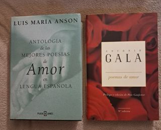 Se incluyen los libros: ANTONIO GALA - "Poemas de amor" El universo amoroso de Antonio Gala resumido en este libro de poemas.----359 páginas---Tapa blanda LUIS MARIA ANSON- "Antología de Mejores Poemas de Amor en Lengua Española"-----L.M. Anson reúne en esta magnífica antología las mejores poesías de amor en lengua española escritas por más de un centenar de poetas de todas las epocas hasta la actualidad.--El lector puede abrir este libro por cualquier página con la seguridad de que sentirá el aliento más hondo de la escritura de los poetas, el mensaje infinito de quienes rindieron sus letras al amor.------640 páginas---Tapa dura.