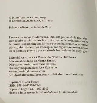JAIRO JUNCIEL Una historia de mar, guerra y misterio ambientada en el siglo XVIII. Siguiendo la estela de Blas de Lezo, esta novela mezcla intriga, épica naval y secretos ocultos en una travesía llena de peligro y destino incierto. Ideal para amantes de la novela histórica con ritmo y acción. Ejemplar de segunda mano en buen estado general. 🏷️ Editorial: Almuzara 🔢 ISBN: 9788417797799 📘 Estado: Buen estado ✏️ Sin anotaciones en sus hojas ❌ No está subrayado Gracias, pero no atendemos propuestas de precio.