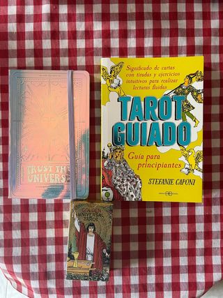 Libro Tarot guiado. Guía para principiantes (Stefanie Caponi). En perfecto estado, nunca usado. Precio original 16,10€. GOLDEN UNIVERSAL TAROT deck, nuevo a estrenar. Nunca abierto ni sacado de su caja. Precio original 27€. Libreta/bloc de notas marca Legami para tomar anotaciones. Precio original 6€.