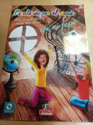 Libro de música titulado Escalando por el mundo con mi fagot. - Autores: María Fernández Bueno y Antonio Mata Moral. - Incluye CD. - Editorial Piles. Plastificado levantado en la parte izquierda de la portada trasera