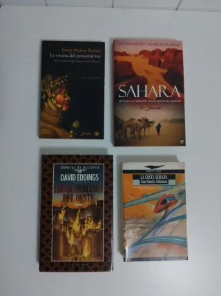 Son libros de diferentes temas: - La cocina del pensamiento (Josep Muñoz): En muy buen estado - La costa dorada (Kim Stanley Robinson): Se ve usado - Los guardianes del oeste vol. 1 de Crónicas de Mallorea (David Eddings): En buen estado - Sáhara (José Maffeo y Ángeles Blanco): En muy buen estado Hago envíos con sobre acolchado. El precio es por cada libro. Oferta: 2€ de descuento si compras otro libro de mi perfil o, si adquieres tres libros, te obsequio con el de menor precio.