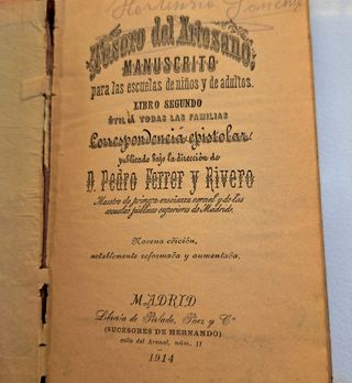 Libro original de 1914, Tesoro del Artesano. Libro Segundo – Correspondencia epistolar, novena edición. Ejemplar difícil de encontrar, con tapa ilustrada original y páginas en buen estado. Ideal coleccionistas o amantes de la historia de la educación. Estado: Bueno para su antigüedad. Cubierta con desgaste en bordes pero completa, páginas interiores limpias y legibles. Encuadernación sólida. Otros libros antiguos en mi perfil