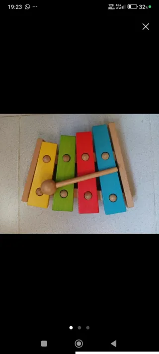 Xilófono de madera con 4 tonos de colores. - Barras de colores: amarillo, verde, rojo y azul. - Incluye mazo de madera con bola. - Base de madera.